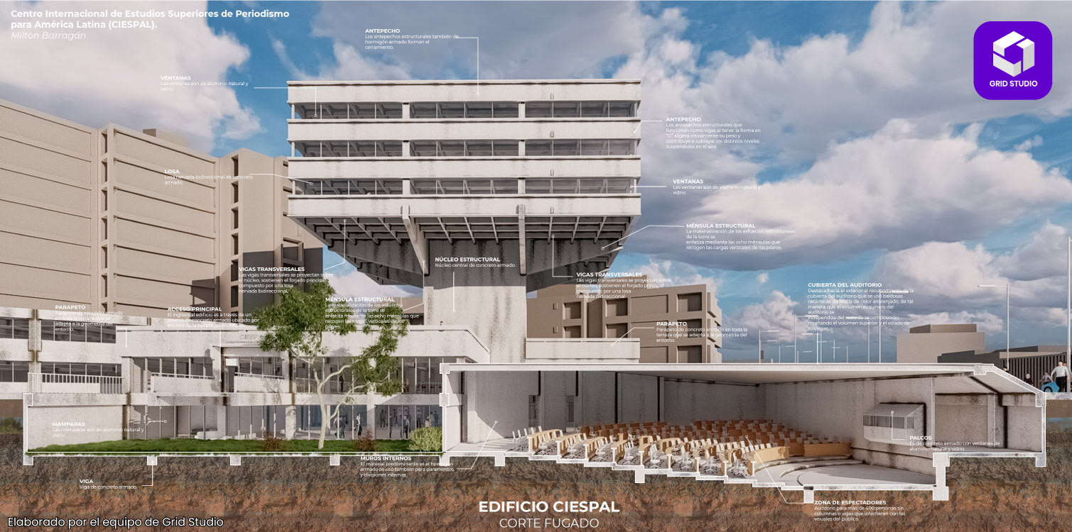 El edificio CIESPAL es la obra arquitectónica brutalista más conocida de Ecuador, su construcción se inició en 1970 y fue inaugurado en el año de 1979. Diseñada por Milton Barragán junto a Ovidio Wappenstein, este referente arquitectónico también se convirtió en escenario de uno los cambios más contemporáneos en la historia del Ecuador.